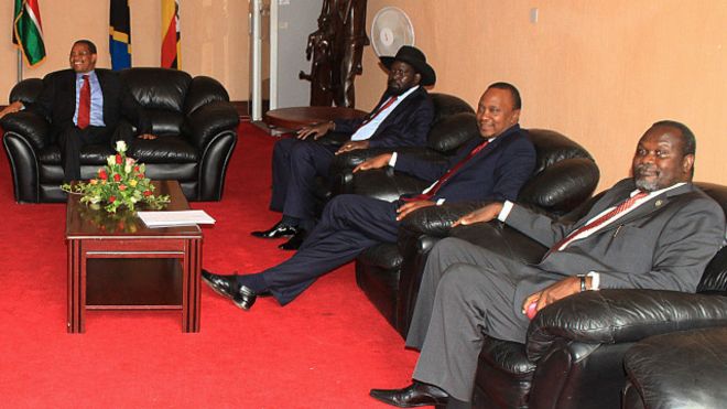 katika mji mkuu wa Juba mbele ya viongozi wa eneo hili.Salva Kiir anakabiliwa na vikwazo pamoja na kikwazo cha umoja wa mataifa cha kutonunua silaha baada ya kukataa kuidhinisha makubaliano hayo. Mpinzani wake ambaye ndio kiongozi wa waasi Riek Machar tayari ameweka sahihi mkataba huo ili kumaliza vita vya wenyewe kwa wenyewe vilivyochukua miezi 20. |