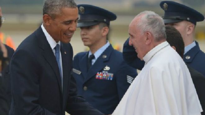 | Papa Francis akikaribishwa Marekani na Rais Barack Obama |